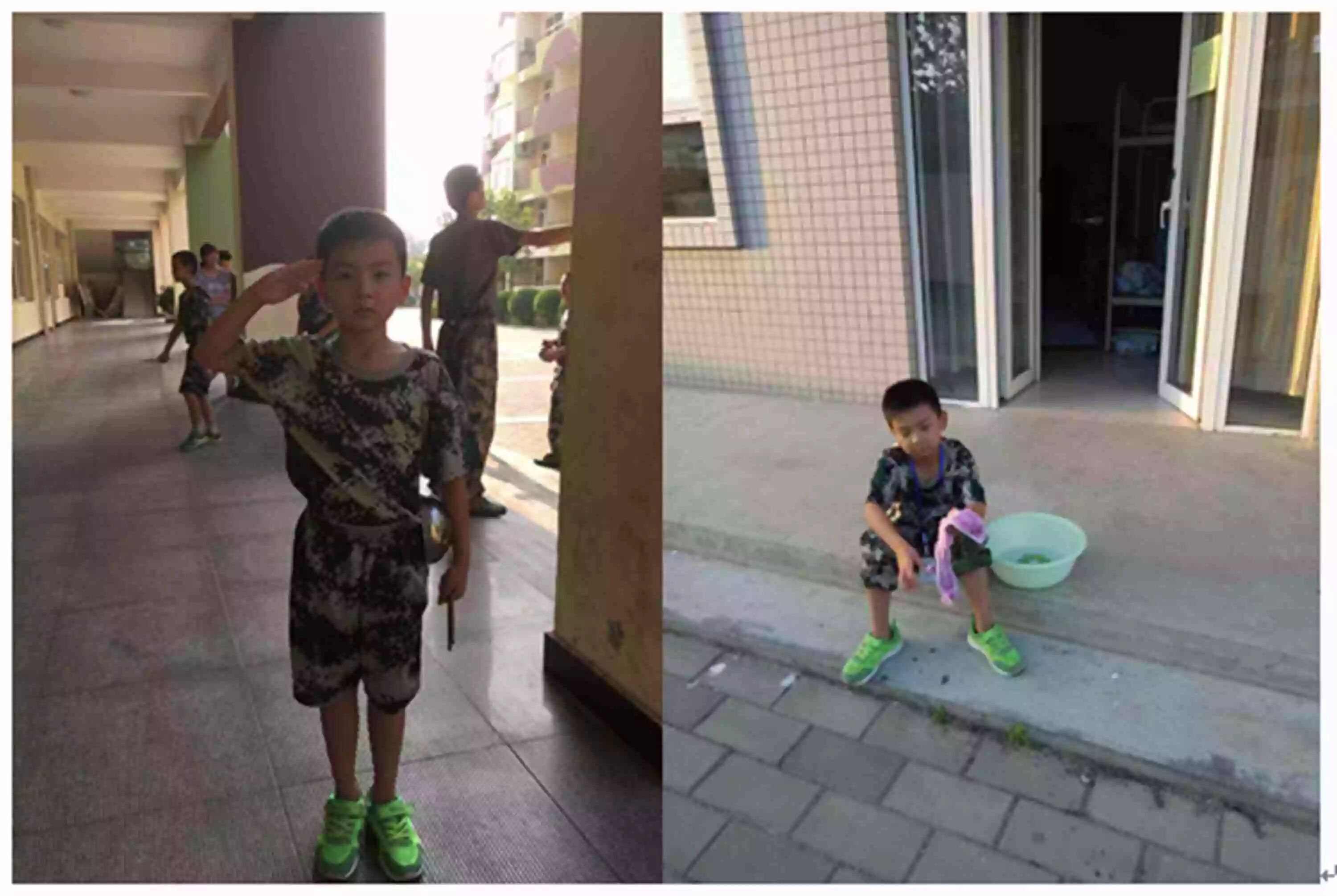 第一天到达营地时已经中午了,吃完饭,领了生活用品,可是看到没有空调的宿舍和硬邦邦的木板床,我整个人都感觉不好了。接下来的时间,基本上都是教官带着我们训练,早上6:30就要起床,教官给我们规定洗脸整理内务10分钟,早饭和中饭各15分钟,晚饭10分钟。所以每天早上一起床大家都飞奔到水龙头下洗脸,稍微迟一点,就得排好长时间才轮到,那样根本不可能在规定时间内完成,那到时候可有得受罚了。接下来是两公里的晨跑,上午站军姿。教官向我们讲解了站立军姿的要领,一声令下,我们就得笔直地站在烈日下。不一会儿,我的额头就冒出了豆大的汗珠,顺着脸颊流下来,痒痒的,真想擦一下,可是没有教官的命令谁都不敢动。下午还有原地踏步,跨立等训练,顶着火辣辣的太阳站在训练场上,真是“热火朝天”啊!